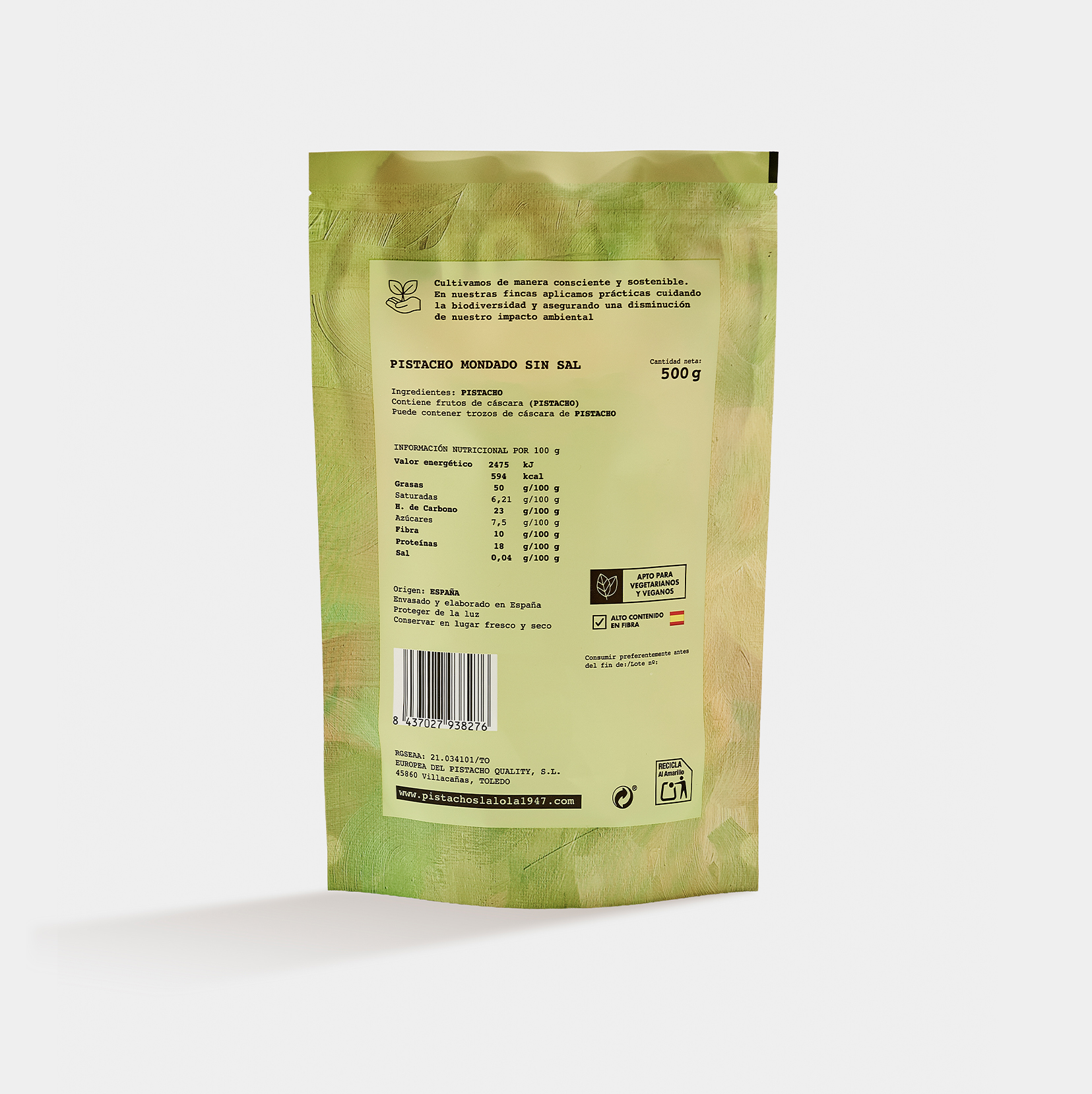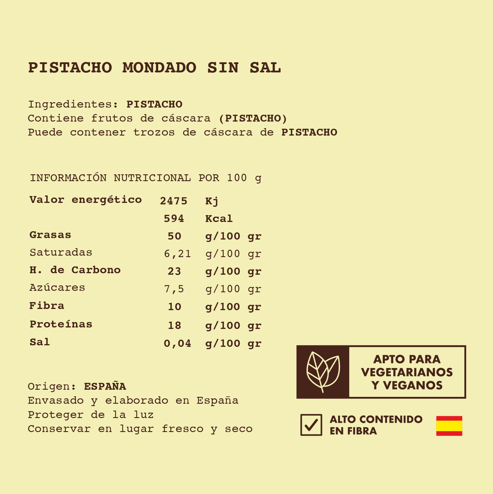 Disfruta del pistacho en su versión más pura con nuestros pistachos mondados naturales. Seleccionados y pelados a mano, conservan todo su sabor, aroma y textura crujiente sin añadir sal ni aditivos.